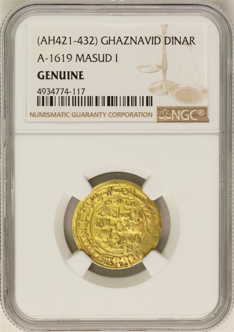 One AH421-432 Ghaznavid Dinar A-1619 Masud I Gold Coin NGC Genuine. NGC Certified.