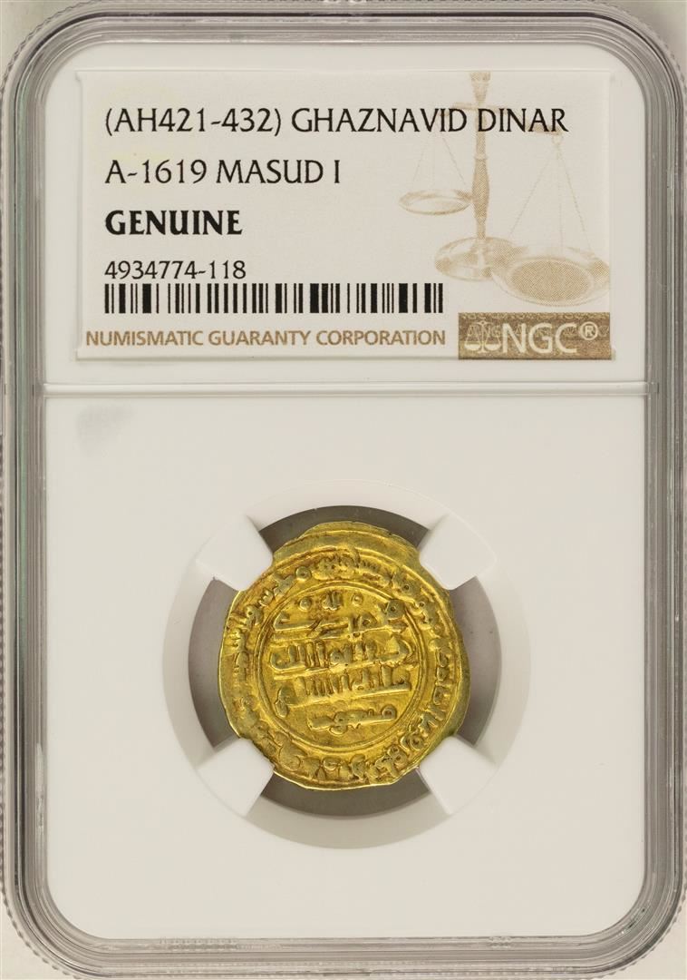 One AH421-432 Ghaznavid Dinar A-1619 Masud I Gold Coin NGC Genuine. NGC Certified.