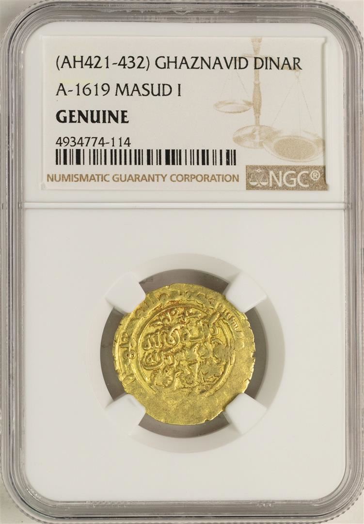 One AH421-432 Ghaznavid Dinar A-1619 Masud I Gold Coin NGC Genuine. NGC Certified.