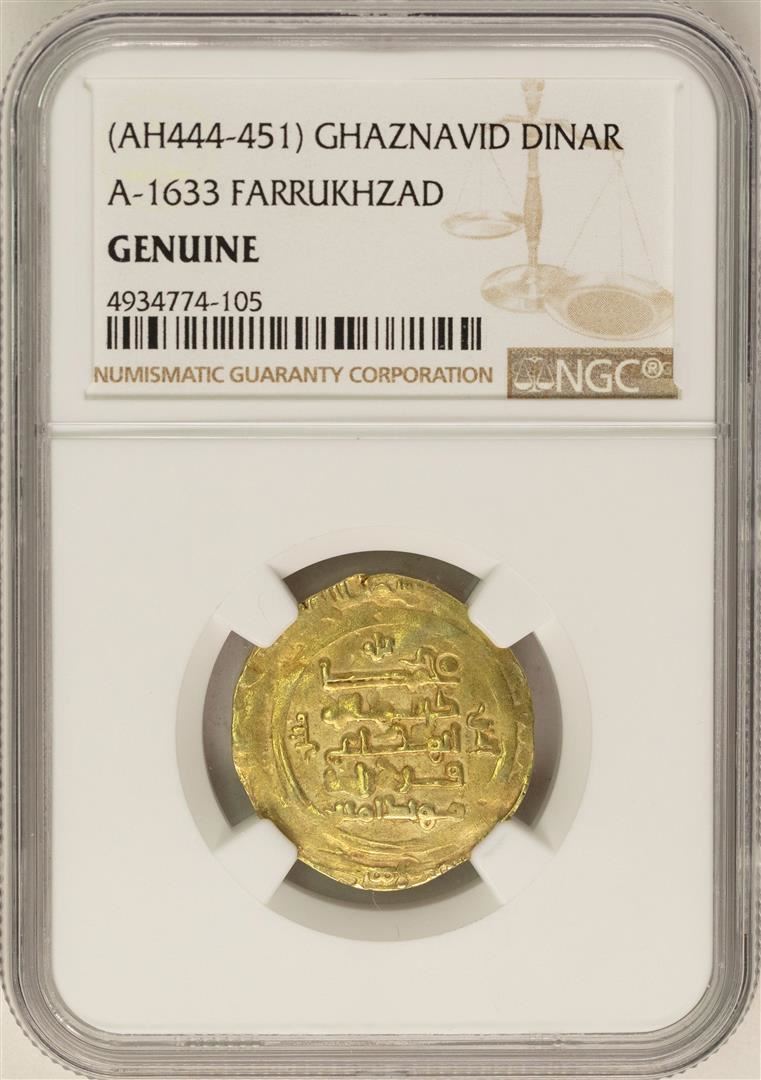 One AH444-451 Ghaznavid Dinar A-1633 Farrukhzad Gold Coin NGC Genuine. NGC Certified.