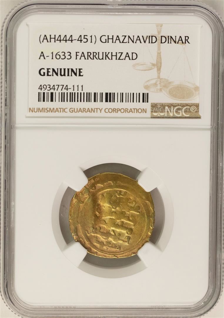 One AH444-451 Ghaznavid Dinar A-1633 Farrukhzad Gold Coin NGC Genuine. NGC Certified.
