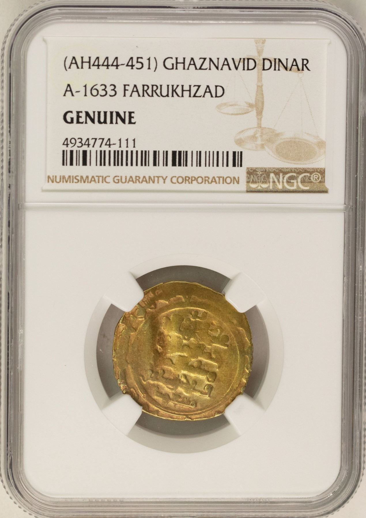 One AH444-451 Ghaznavid Dinar A-1633 Farrukhzad Gold Coin NGC Genuine.