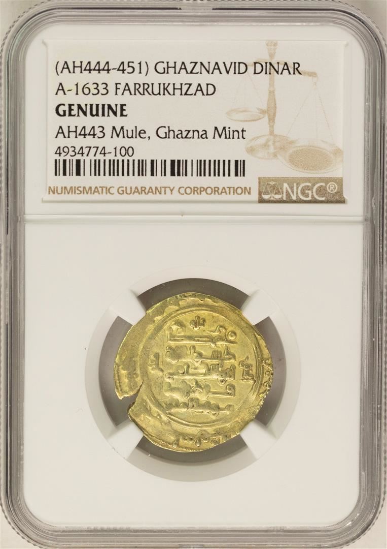 One AH444-451 Ghaznavid Dinar AH433 Farrukhzad Gold Coin NGC Genuine Mule Ghazna Mint. NGC Certified.