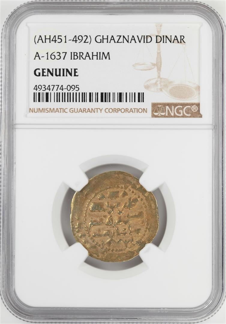One AH451-492 Ghaznavid Dinar A-1637 Ibrahim Gold Coin NGC Genuine. NGC Certified.