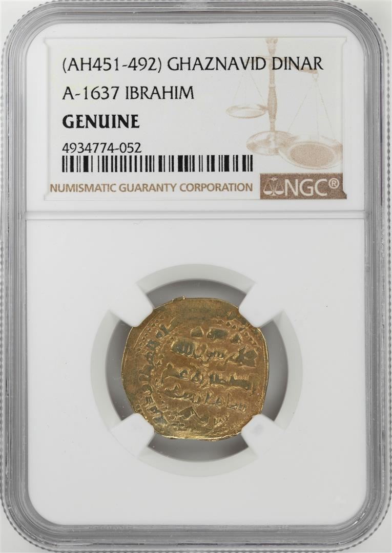 One AH451-492 Ghaznavid Dinar A-1637 Ibrahim Gold Coin NGC Genuine. NGC Certified.