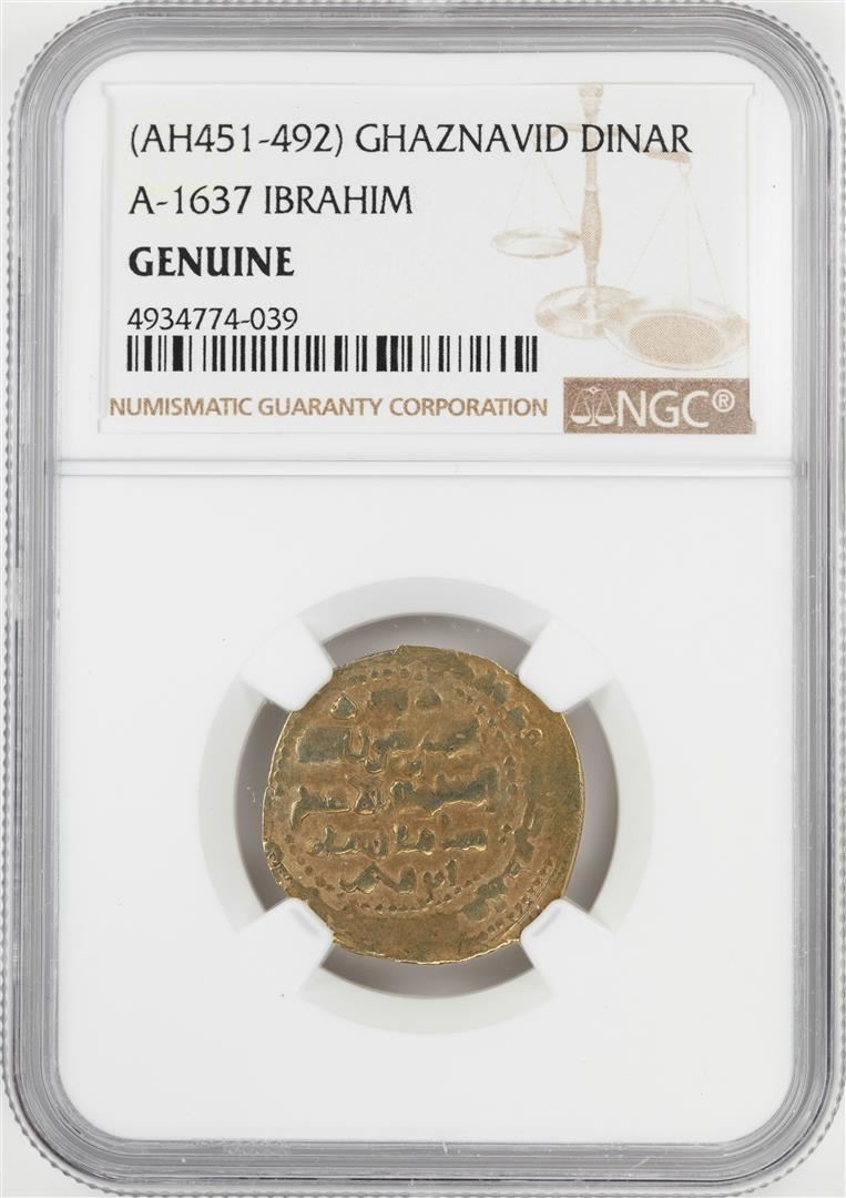 One AH451-492 Ghaznavid Dinar A-1637 Ibrahim Gold Coin NGC Genuine. NGC Certified.