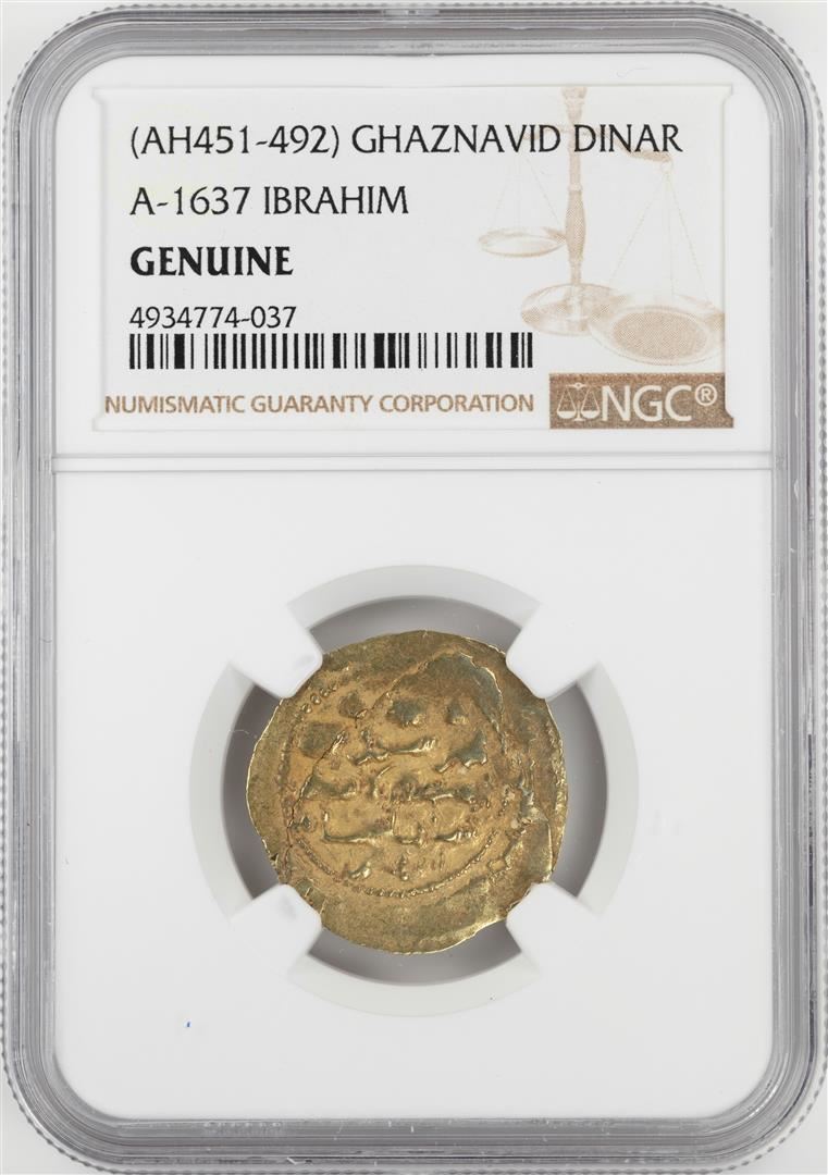 One AH451-492 Ghaznavid Dinar A-1637 Ibrahim Gold Coin NGC Genuine. NGC Certified.