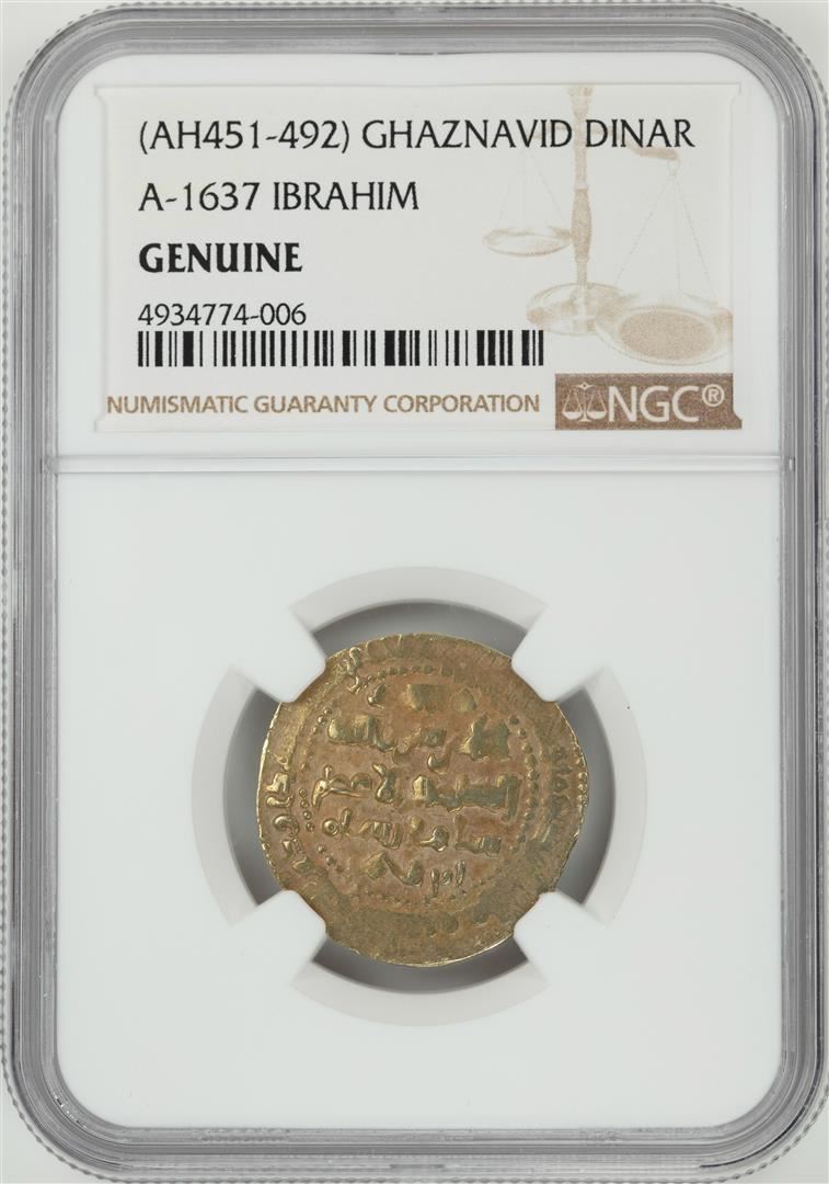 One AH451-492 Ghaznavid Dinar A-1637 Ibrahim Gold Coin NGC Genuine. NGC Certified.