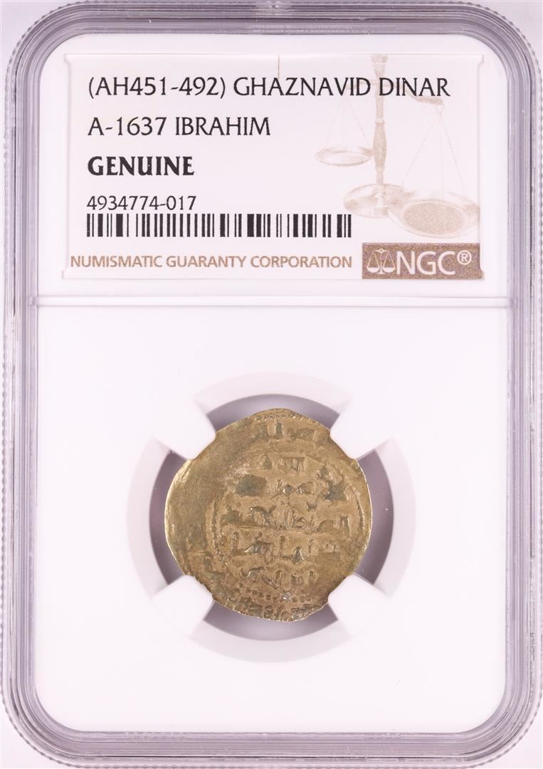 One AH451-492 Ghaznavid Dinar A-1637 Ibrahim Gold Coin NGC Genuine. NGC Certified.