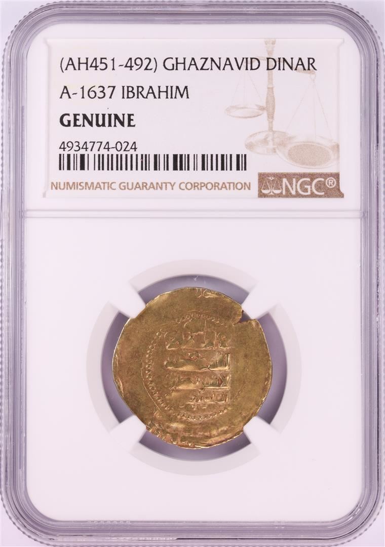 One AH451-492 Ghaznavid Dinar A-1637 Ibrahim Gold Coin NGC Genuine. NGC Certified.