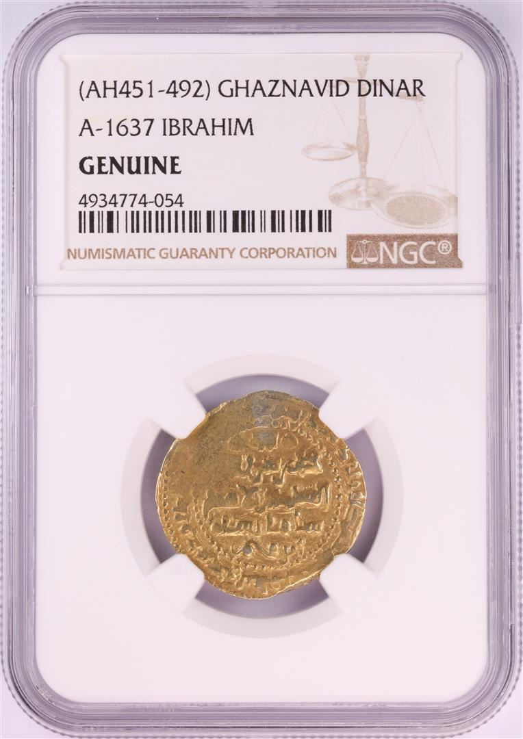 One AH451-492 Ghaznavid Dinar A-1637 Ibrahim Gold Coin NGC Genuine. NGC Certified.