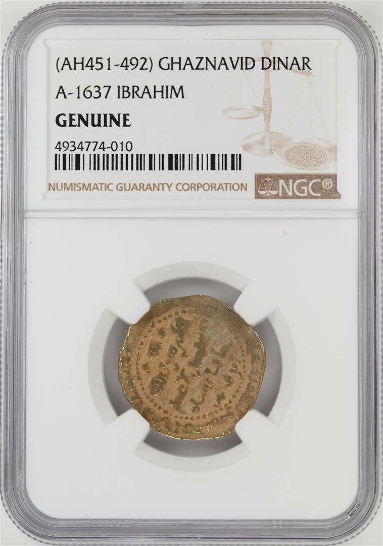 One AH451-492 Ghaznavid Dinar A-1637 Ibrahim Gold Coin NGC Genuine. NGC Certified.