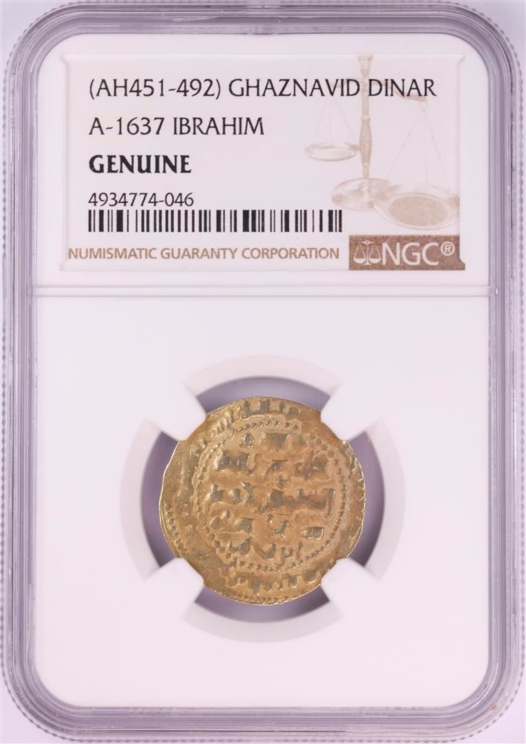One AH451-492 Ghaznavid Dinar A-1637 Ibrahim Gold Coin NGC Genuine. NGC Certified.