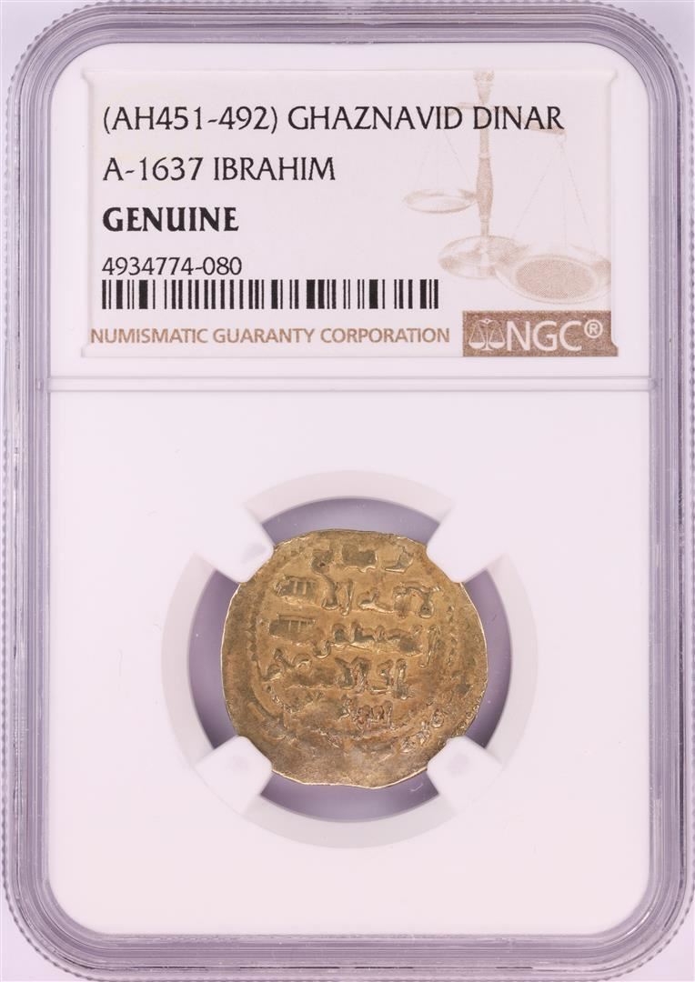 One AH451-492 Ghaznavid Dinar A-1637 Ibrahim Gold Coin NGC Genuine. NGC Certified.