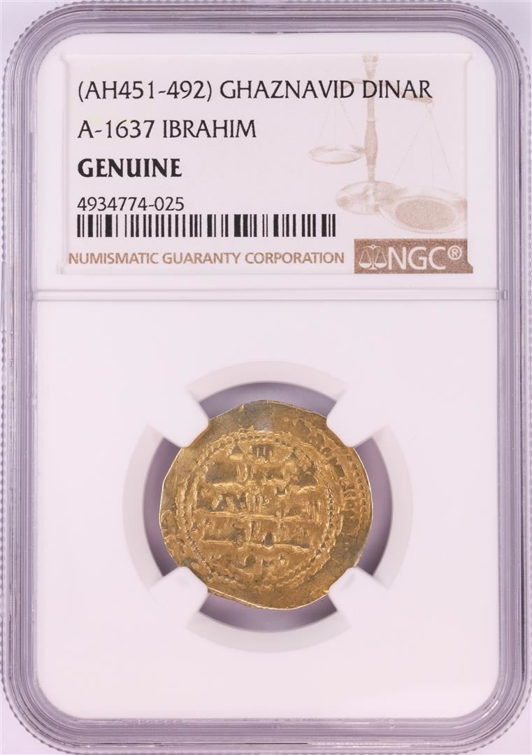 One AH451-492 Ghaznavid Dinar A-1637 Ibrahim Gold Coin NGC Genuine. NGC Certified.