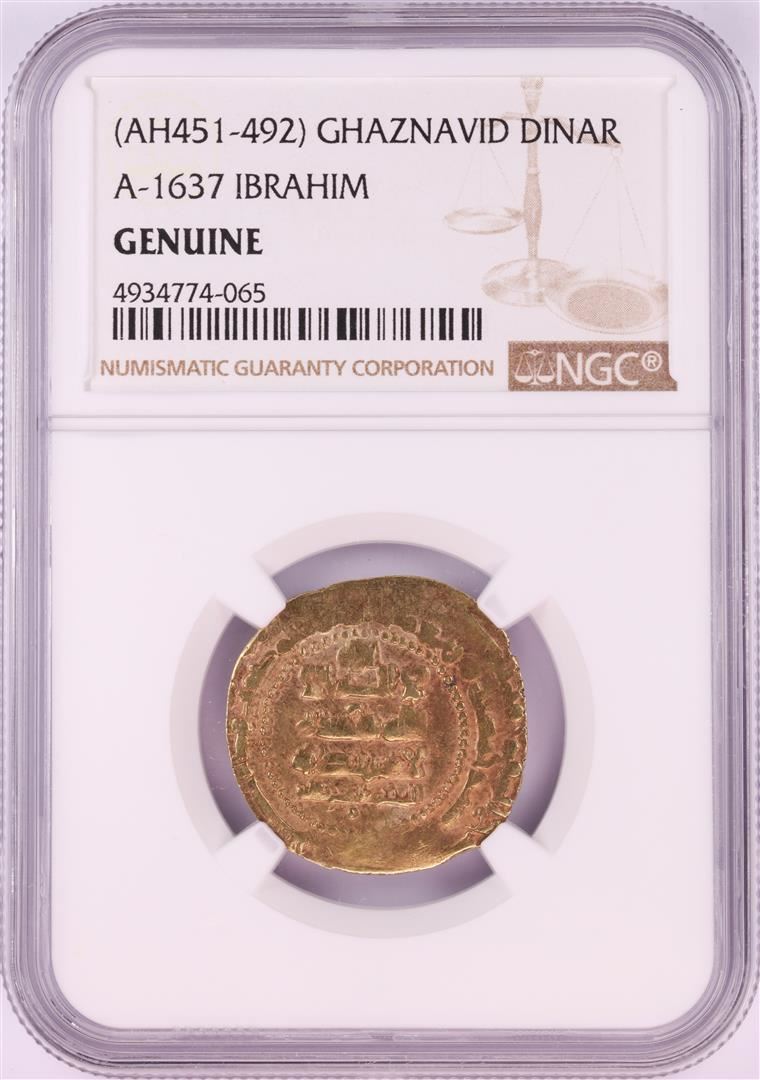 One AH451-492 Ghaznavid Dinar A-1637 Ibrahim Gold Coin NGC Genuine. NGC Certified.