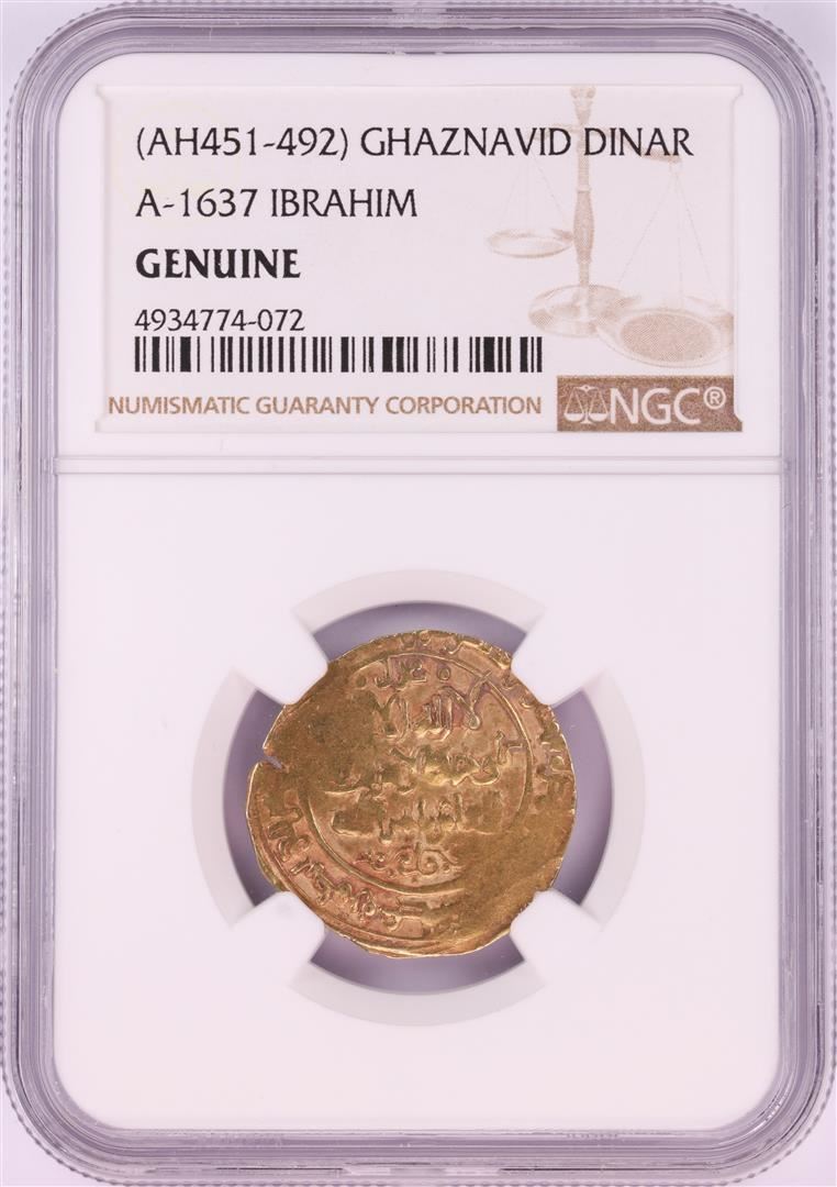 One AH451-492 Ghaznavid Dinar A-1637 Ibrahim Gold Coin NGC Genuine. NGC Certified.