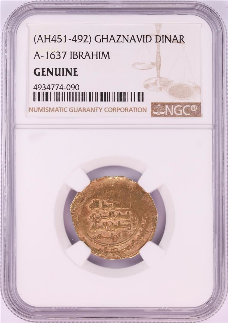 One AH451-492 Ghaznavid Dinar A-1637 Ibrahim Gold Coin NGC Genuine. NGC Certified.