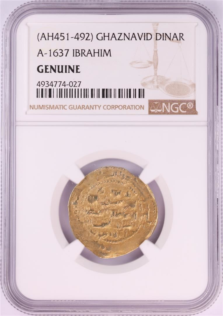 One AH451-492 Ghaznavid Dinar A-1637 Ibrahim Gold Coin NGC Genuine. NGC Certified.