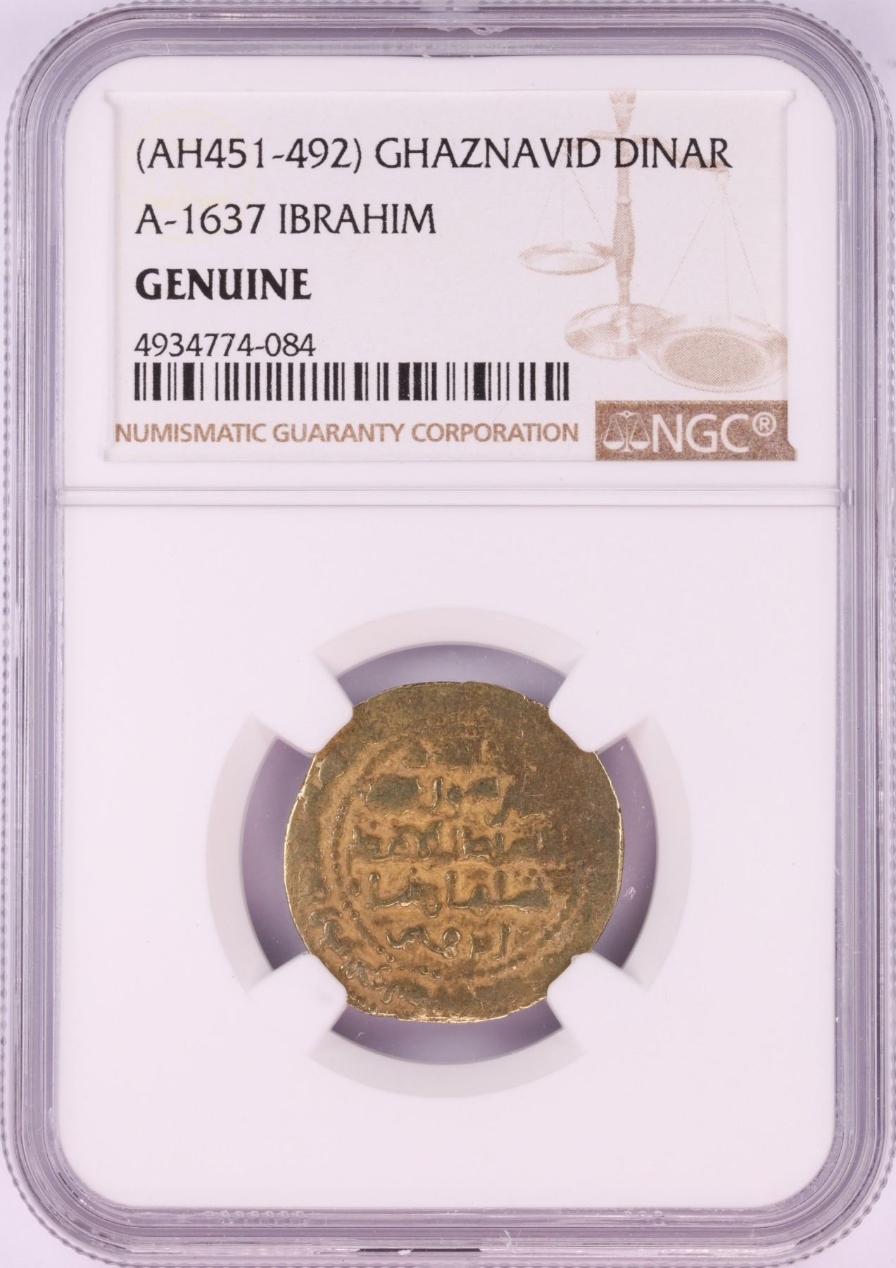 One AH451-492 Ghaznavid Dinar A-1637 Ibrahim Gold Coin NGC Genuine.