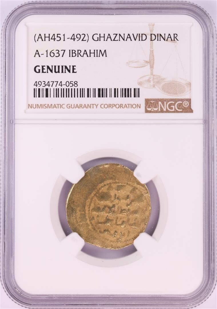 One AH451-492 Ghaznavid Dinar A-1637 Ibrahim Gold Coin NGC Genuine. NGC Certified.