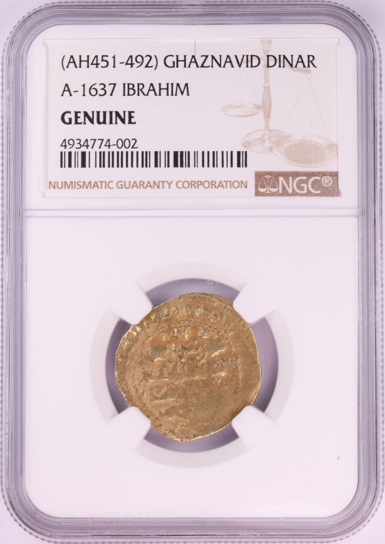 One AH451-492 Ghaznavid Dinar A-1637 Ibrahim Gold Coin NGC Genuine.