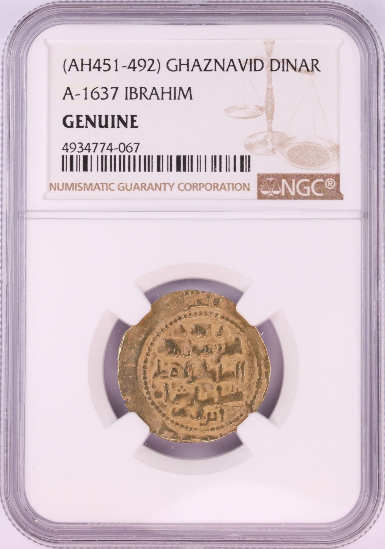 One AH451-492 Ghaznavid Dinar A-1637 Ibrahim Gold Coin NGC Genuine.