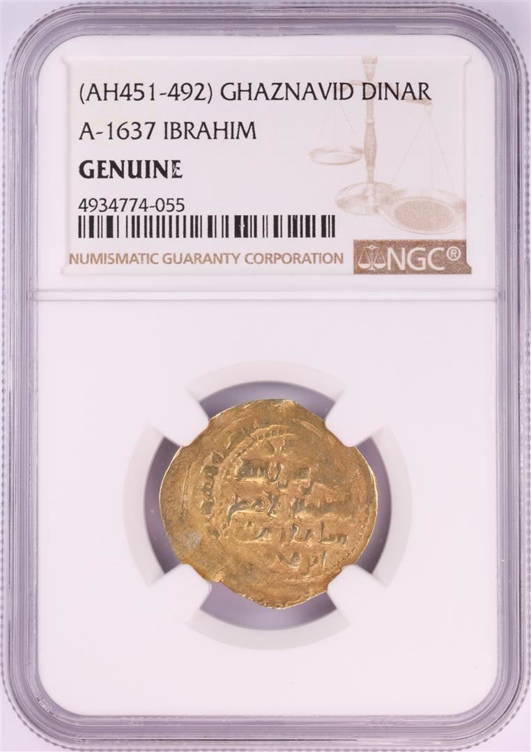 One AH451-492 Ghaznavid Dinar A-1637 Ibrahim Gold Coin NGC Genuine. NGC Certified.