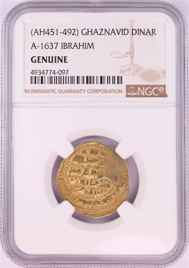 One AH451-492 Ghaznavid Dinar A-1637 Ibrahim Gold Coin NGC Genuine. NGC Certified.