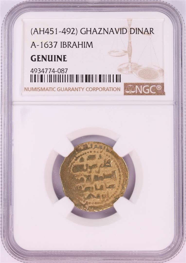 One AH451-492 Ghaznavid Dinar A-1637 Ibrahim Gold Coin NGC Genuine. NGC Certified.
