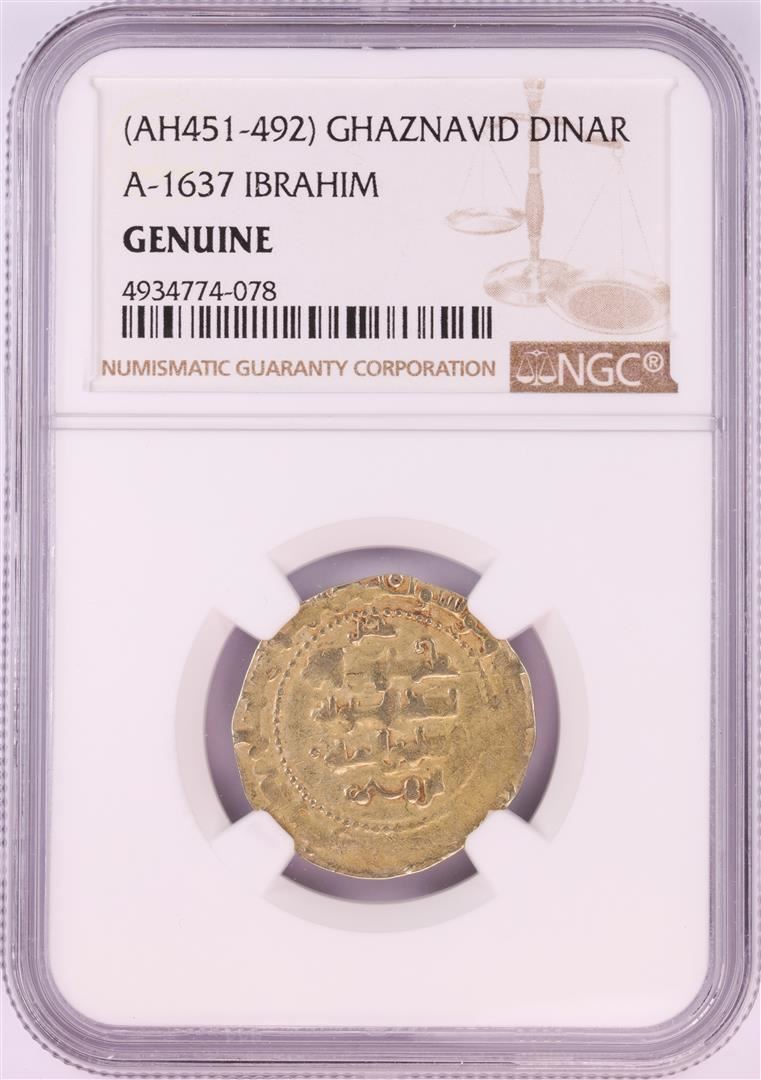 One AH451-492 Ghaznavid Dinar A-1637 Ibrahim Gold Coin NGC Genuine. NGC Certified.
