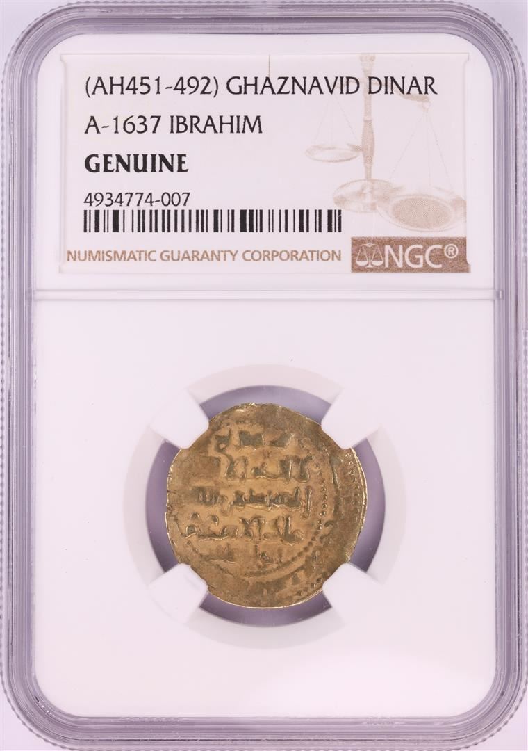 One AH451-492 Ghaznavid Dinar A-1637 Ibrahim Gold Coin NGC Genuine. NGC Certified.