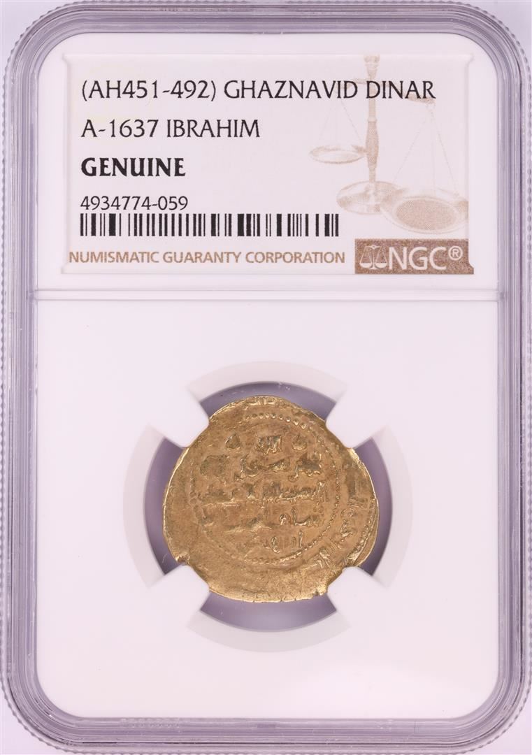 One AH451-492 Ghaznavid Dinar A-1637 Ibrahim Gold Coin NGC Genuine. NGC Certified.
