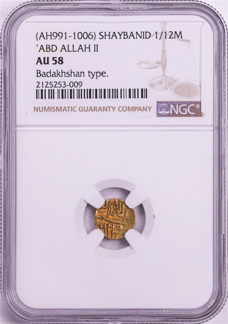 One AH991-1006 Shaybanid 1/12 Mohur 'ABD Allah II' Badakhshan Type Gold Coin NGC AU58. NGC Certified.