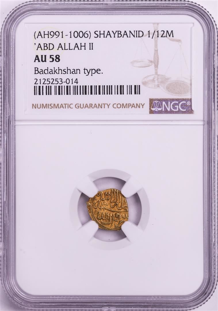 One AH991-1006 Shaybanid 1/12 Mohur 'ABD Allah II' Badakhshan Type Gold Coin NGC AU58. NGC Certified.