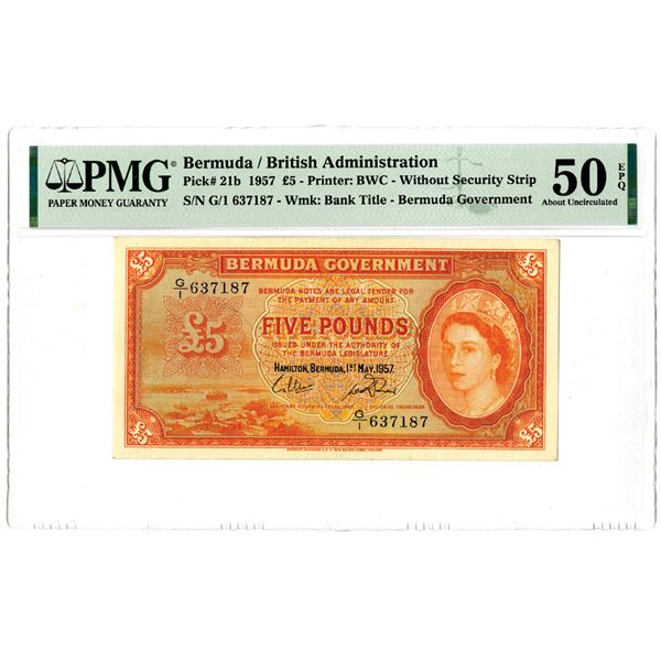 Bermuda/British Administration. 1957. 5 Pounds, P-21b, Issued banknote, Orange on multicolor underprint, S/N G/1 637187, Watermark: Bank Title, Withou