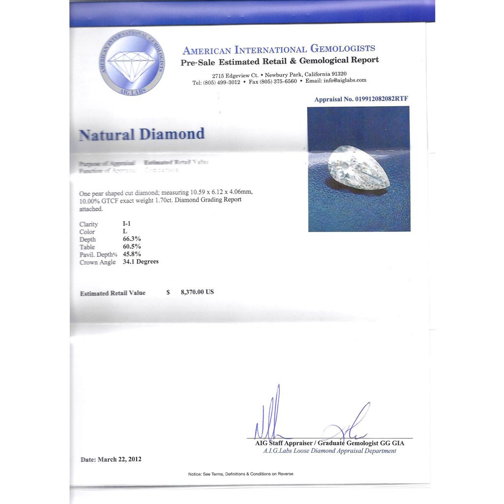AIG Cert.: 019912082082 RTF 1.70 ctw Diamond L/I1 **|**|** ; MSRP: $8370