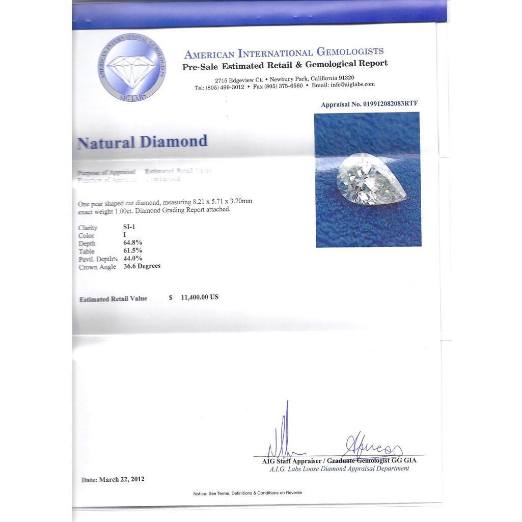 AIG Cert.: 019912082083 RTF 1.00 ctw Diamond I/SI1 **|**|** ; MSRP: $11400