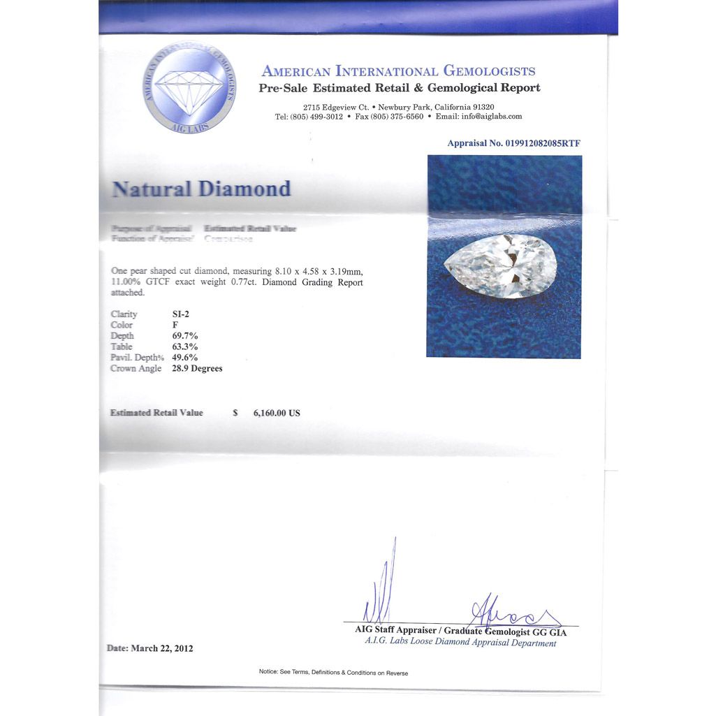AIG Cert. RTF 0.77 ctw Diamond F/SI2 **|**|** ; MSRP: $6160