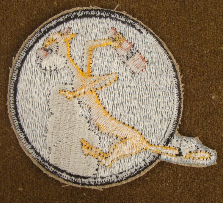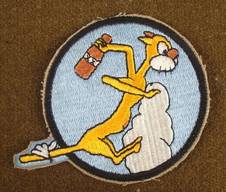 OFFERED HERE IS AN AIR SQUADRON MASCOT PATCH. WE BELIEVE THAT THE PATCH IS A REPRODUCTION. IT IS EMBROIDERED WITH A 1/2 CAT, 1/2 DONKEY IN YELLOW, ON A CLOUD TOSSING A WHISKEY BOTTLE. IT MEASURES OUT TO BE 3 1/4" IN DIAMETER. *