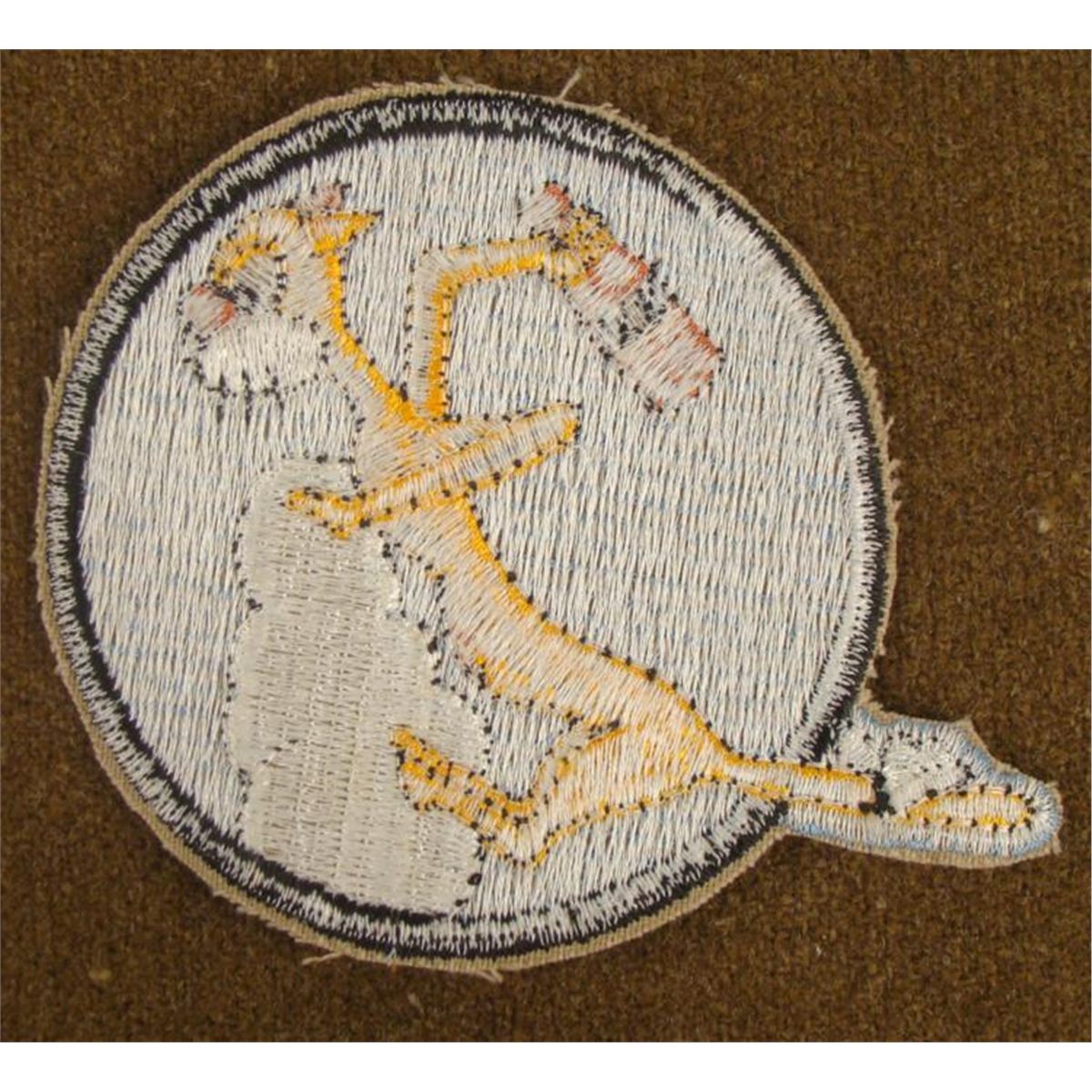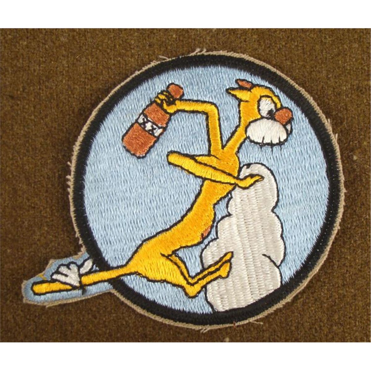 OFFERED HERE IS AN AIR SQUADRON MASCOT PATCH. WE BELIEVE THAT THE PATCH WAS EITHER FROM WWII OR KOREA. IT IS EMBROIDERED WITH A 1/2 CAT, 1/2 DONKEY IN YELLOW, ON A CLOUD TOSSING A WHISKEY BOTTLE. IT MEASURES OUT TO BE 3 1/4" IN DIAMETER. *