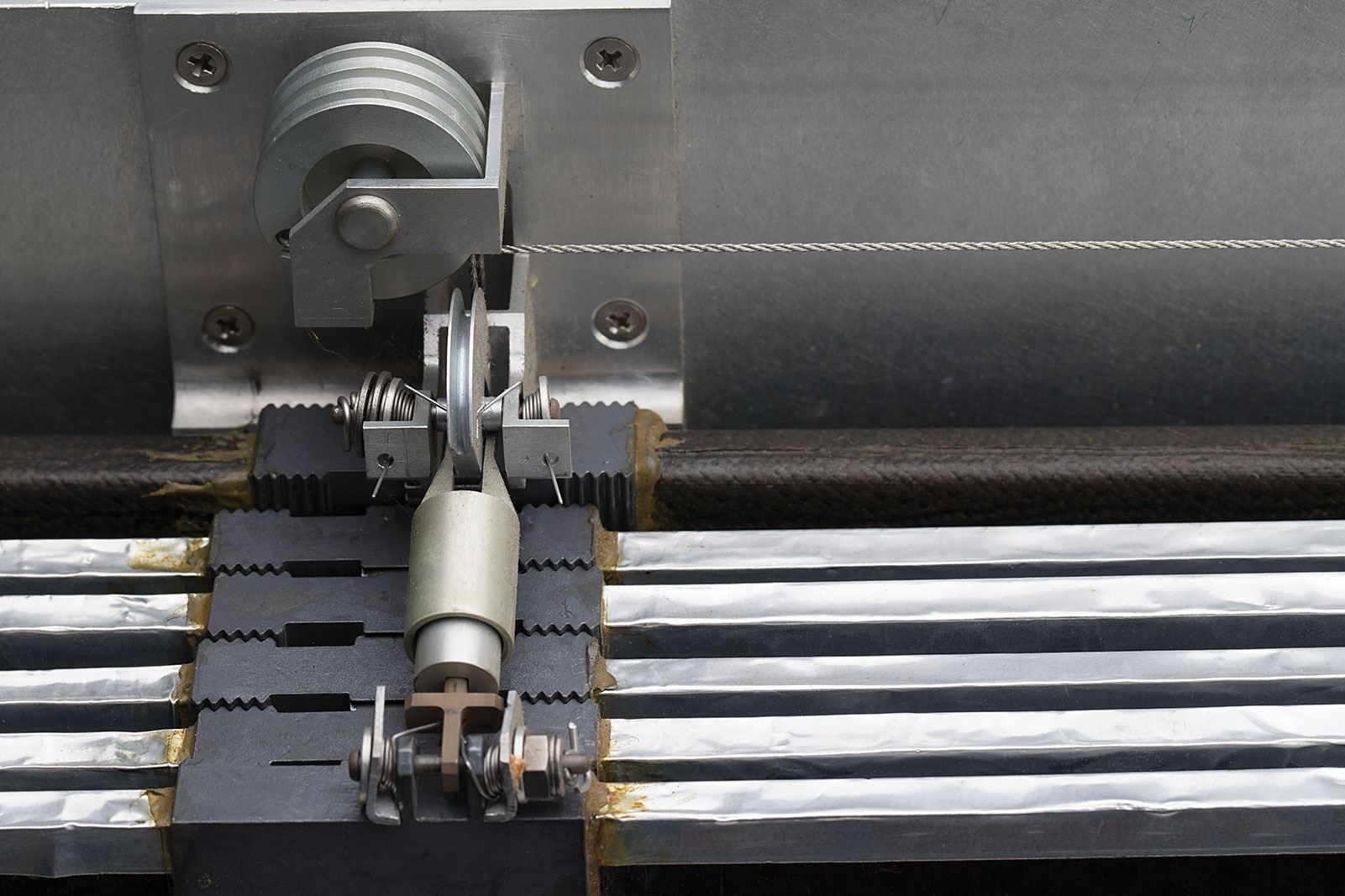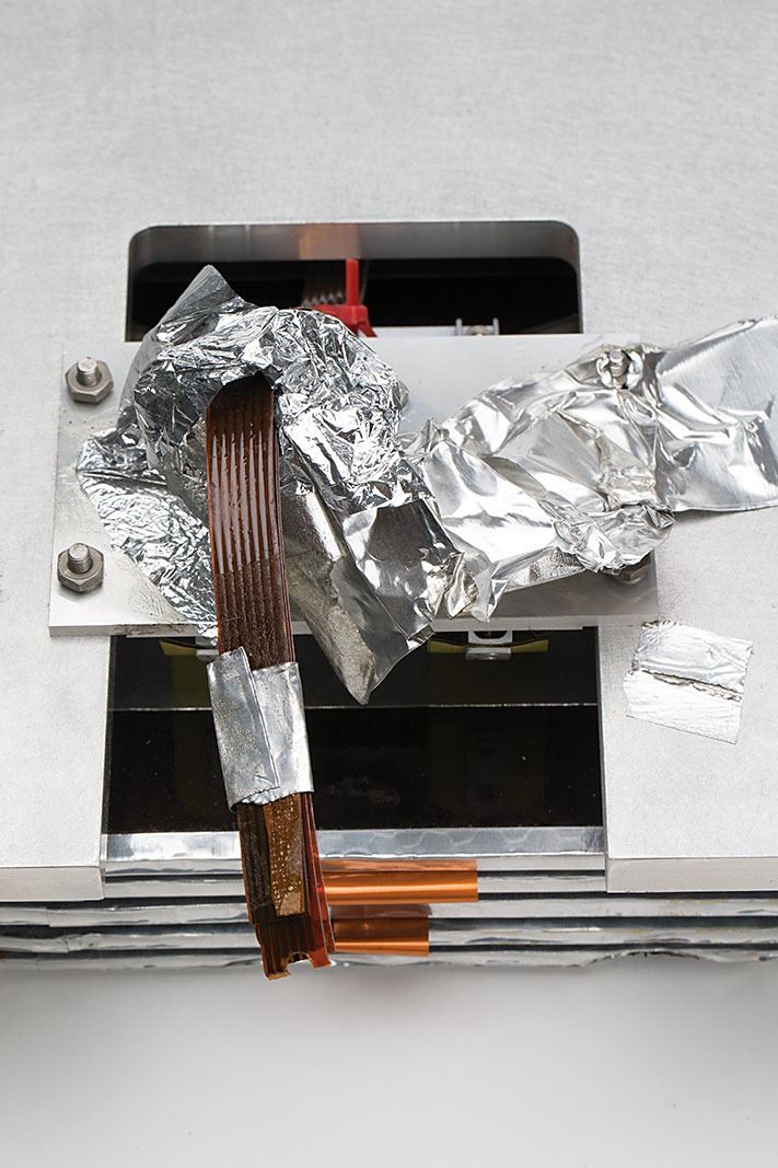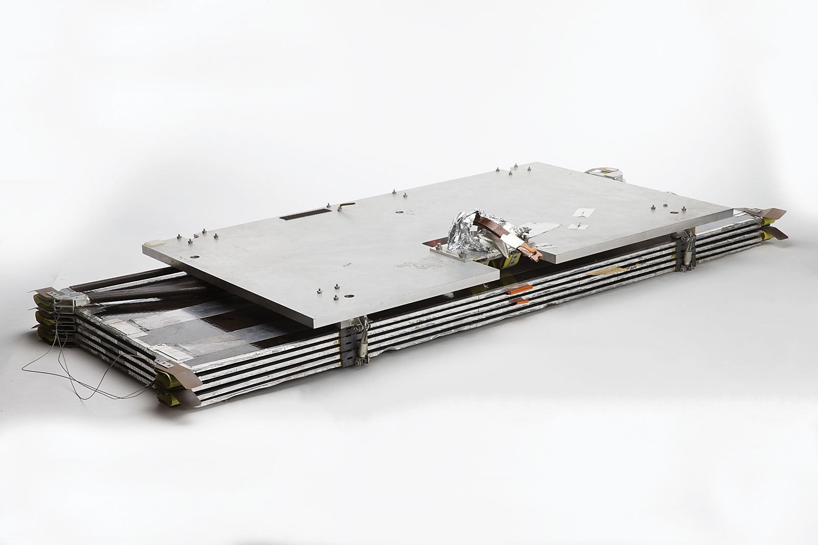 AIT Solar Array featuring five spring-loaded solar panels, measuring 17? x 43? x 3.5?, marked with part numbers, "11982-D122715-1, A1 MFR 9K893" and "11982D122705-9." Each of the five panels measures 14? x 40?, and they are secured in their undeployed state by a latch mechanism. In very good to fine condition, with some minor damage to the rear of the outer panel.
