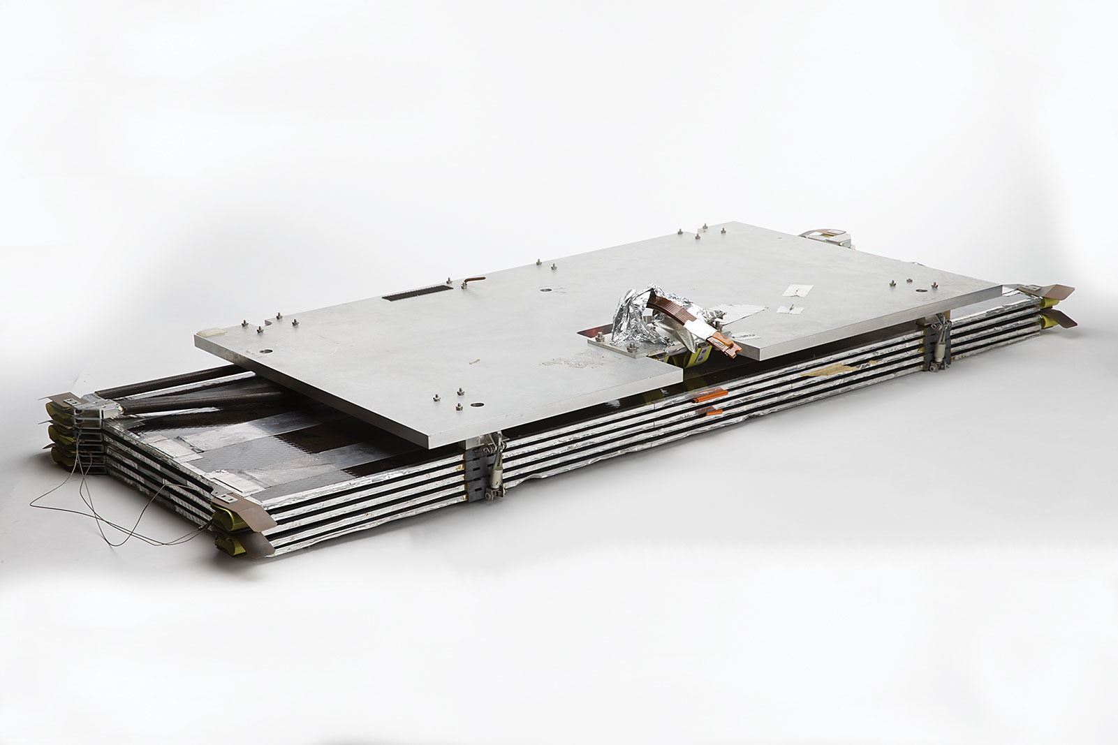 AIT Solar Array featuring five spring-loaded solar panels, measuring 17˝ x 43˝ x 3.5˝, marked with part numbers, "11982-D122715-1, A1 MFR 9K893" and "11982D122705-9." Each of the five panels measures 14˝ x 40˝, and they are secured in their undeployed state by a latch mechanism. In very good to fine condition, with some minor damage to the rear of the outer panel.