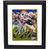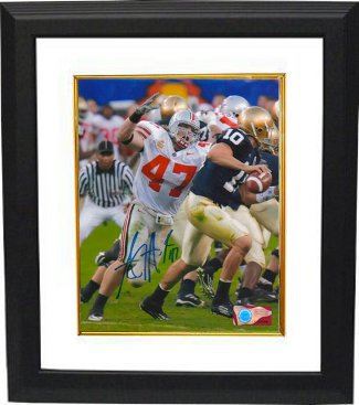 A. J. Hawk played for Ohio State Buckeyes from 2002–2005, where in his senior year of '05, he ended up winning the Lombardi Award as best college football linebacker. In his entire college career, He had 394 tackles, 15 sacks, 7 interceptions, and recovered 3 fumbles. AJ Hawk has hand autographed this Ohio State Buckeyes 8x10 Color Photo. Cardboard Heroes Hologram and Certificate of Authenticity from Athlon Sports. Custom White Mat and Premium Black Frame as shown.