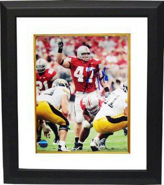 A. J. Hawk played for Ohio State Buckeyes from 2002–2005, where in his senior year of '05, he ended up winning the Lombardi Award as best college football linebacker. In his entire college career, He had 394 tackles, 15 sacks, 7 interceptions, and recovered 3 fumbles. AJ Hawk has hand autographed this Ohio State Buckeyes 8x10 Color Photo. Cardboard Heroes Hologram and Certificate of Authenticity from Athlon Sports. Custom White Mat and Premium Black Frame as shown.