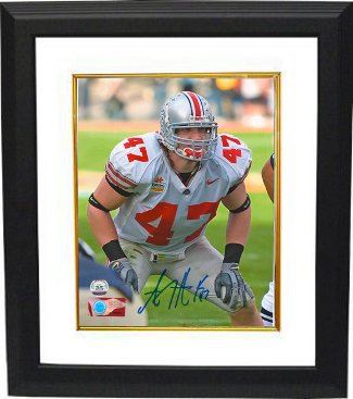 A. J. Hawk played for Ohio State Buckeyes from 2002–2005, where in his senior year of '05, he ended up winning the Lombardi Award as best college football linebacker. In his entire college career, He had 394 tackles, 15 sacks, 7 interceptions, and recovered 3 fumbles. AJ Hawk has hand autographed this Ohio State Buckeyes 8x10 Color Photo. Cardboard Heroes Hologram and Certificate of Authenticity from Athlon Sports. Custom Black Mat and Premium Black Frame as shown.
