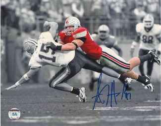 A. J. Hawk played for Ohio State Buckeyes from 2002–2005, where in his senior year of '05, he ended up winning the Lombardi Award as best college football linebacker. In his entire college career, He had 394 tackles, 15 sacks, 7 interceptions, and recovered 3 fumbles. AJ Hawk has hand autographed this Ohio State Buckeyes 8x10 Spotlight Photo. Cardboard Heroes Hologram and Certificate of Authenticity from Athlon Sports.