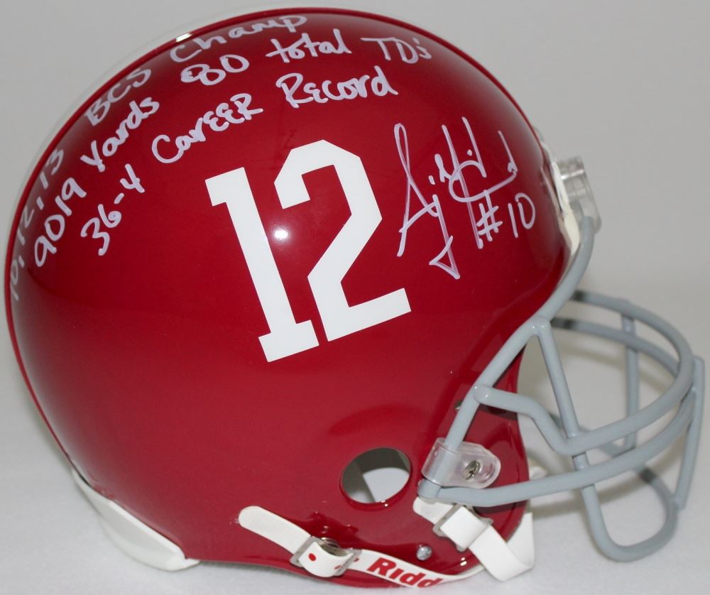 Full-size authentic pro-line helmet. Hand-signed and inscribed in white paint pen by AJ McCarron (Bengals). The autograph includes an official Radtke Sports hologram and matching COA for authenticity purposes. AJ McCarron is a Radtke Sports exclusive athlete. Also includes a proof picture from the signing.