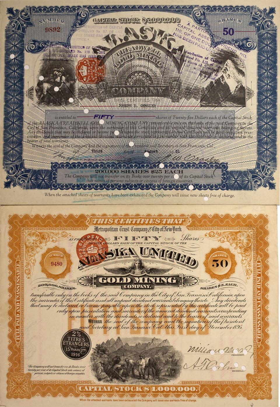 Lot of 2, including: 1) Alaska United Gold Mining Company, issued to Metropolitan Trust Company of the City of New York for 50 shares in 1895. Signatures of President and Secretary obscured by hole cancellations. Vignette at bottom of four prospectors above ground with mule and jagged peaks of mountains in background. Red six pence seal revenue stamp on certificate. Orange border with black print. Printer: ABN. Cancelled by hole punches, measures 10" x 8". The Alaska United GMC held property on Douglas Island, becoming the Alaska Juneau MC following its merger with the Treadwell GMC in 1928. 2) Alaska Treadwell Gold Mining Company, issued to Joseph D. Gengler for 50 shares in 1931. Signed by J.W. Crosby as Vice-President and (illegible) as Secretary. Two vignettes: one of two miners underground, one calling up to surface for full ore bucket to be pulled up on the center left; the other vignette is of high mountains on the center right. Measures 10" x 8", with ornate blue border and black underprint. Cancelled with hole punches. Partial distribution stamps No. 117-120 visible around the masthead. The company owned the Treadwell mine on Douglas Island, once known as the Paris mine. This was one of Alaska's largest gold mines, one time funded by Bernard Baruch. The Alaska Treadwell, Alaska United, Alaskan Mexican Gold merged in 1928 into Alaska Juneau Gold Mining Co. Their partner was the Homestake Mining Company [Ref: Weed].
