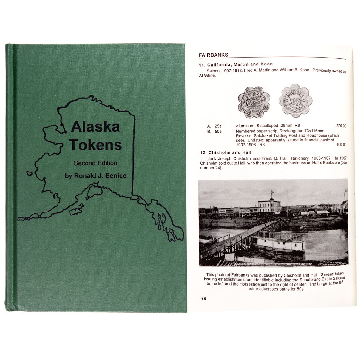 Benice, Ronald J. Alaska Tokens. Second Ed., 1994, Token and Medal Society. Includes a wide swath of tokens from Alaska for tokens as early as 1905. Index covers Alaska towns and businesses operating in the first half of the 20th century. 334 pp. Hardbound in green cloth. 6" x 9". - Vinegar Collection